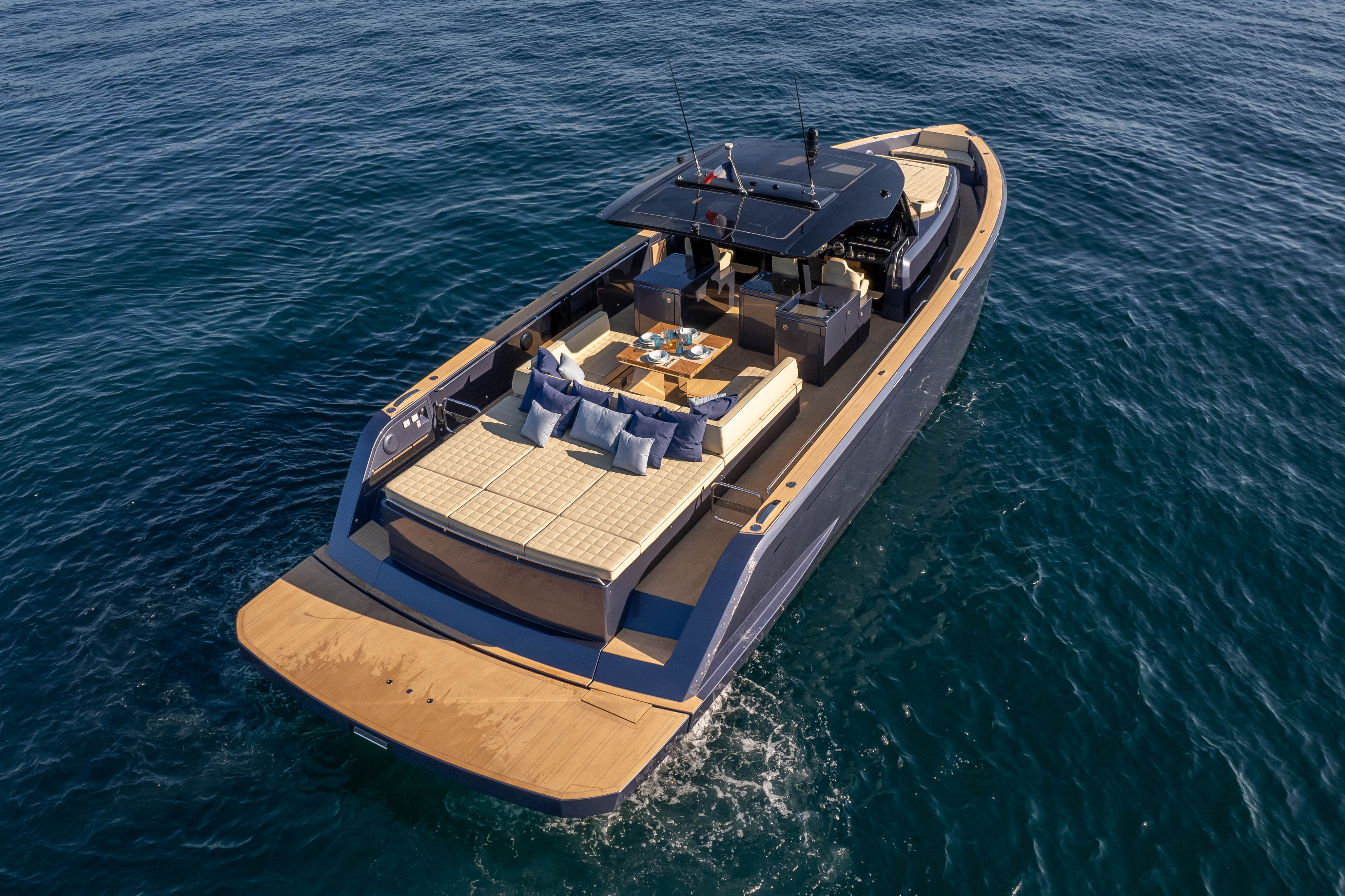 ON BOARD: OUTDOOR KITCHEN, FRIDGE, COFFEE MACHINE, BLUETOOTH STEREO, ROCKFORD AUDIO SYSTEM, LARGE HYDRAULIC BATHING PLATFORM, COCKPIT SHOWER, 1 LARGE MODULAR COCKPIT TABLE IN SUN LOUNGE, BIMINI TOP, FORWARD AND AFT SUN LOUNGE…